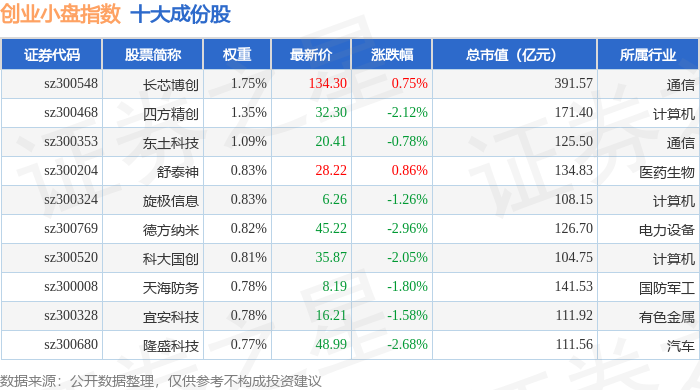 证券之星消息,12月9日,创业小盘(399020)指数报收于1735.52点,跌0.45%,成交898.95亿元,换手率4.41%。当日该指数成份股中,上涨的有77家,陕西华达以20.0%的涨幅领涨,下跌的有219家,中富电路以7.09%的跌幅领跌。
