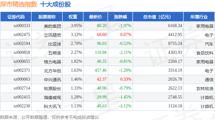 资金流向方面,深市精选(399013)指数成份股当日主力资金净流出合计120.06亿元,游资资金净流入合计22.4亿元,散户资金净流入合计97.67亿元。成份股资金流向详情见下表: