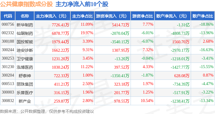 资金流向方面,公共健康(399277)指数成份股当日主力资金净流出合计7.92亿元,游资资金净流出合计291.95万元,散户资金净流入合计7.95亿元。成份股资金流向详情见下表: