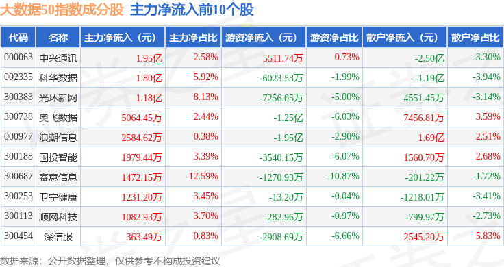 资金流向方面,大数据50(399282)指数成份股当日主力资金净流出合计25.06亿元,游资资金净流出合计2.8亿元,散户资金净流入合计27.86亿元。成份股资金流向详情见下表: