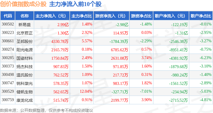 资金流向方面,创价值(399295)指数成份股当日主力资金净流出合计30.25亿元,游资资金净流入合计8.45亿元,散户资金净流入合计21.79亿元。成份股资金流向详情见下表: