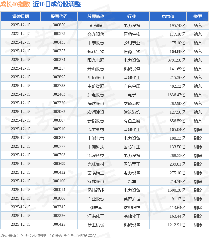 近10日内成长40(399326)指数成份股做了调整,新纳入了12只股票,剔除了12只股票。