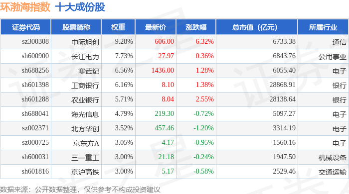 证券之星消息,12月9日,环渤海(399357)指数报收于3632.16点,涨0.41%,成交777.15亿元,换手率0.23%。当日该指数成份股中,上涨的有8家,中际旭创以6.32%的涨幅领涨,下跌的有31家,中国建筑以2.84%的跌幅领跌。