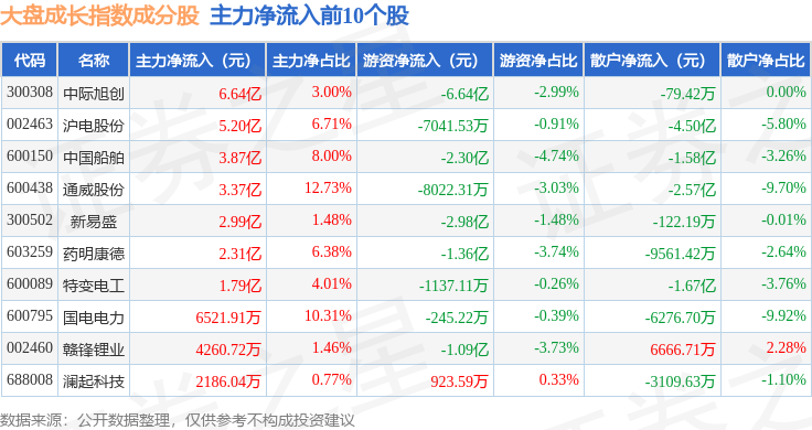 资金流向方面,大盘成长(399372)指数成份股当日主力资金净流出合计66.96亿元,游资资金净流入合计26.92亿元,散户资金净流入合计40.04亿元。成份股资金流向详情见下表: