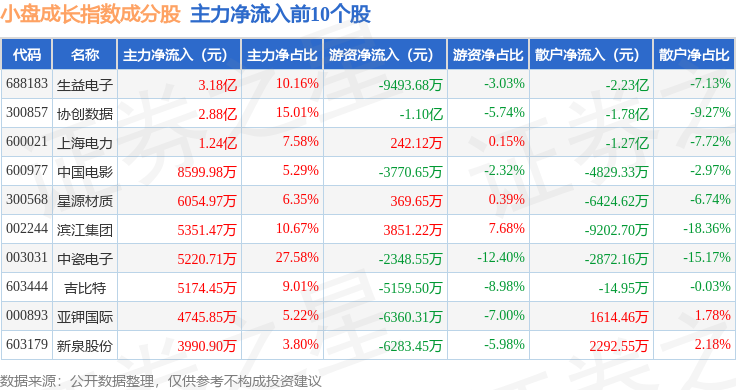 资金流向方面,小盘成长(399376)指数成份股当日主力资金净流出合计41.16亿元,游资资金净流入合计7.35亿元,散户资金净流入合计33.35亿元。成份股资金流向详情见下表: