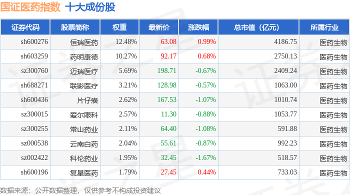 国证医药(399394)指数十大成份股详情如下: