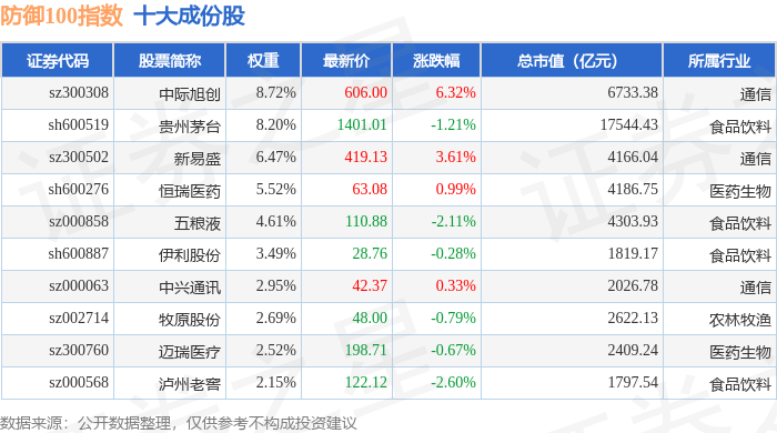 防御100(399403)指数十大成份股详情如下: