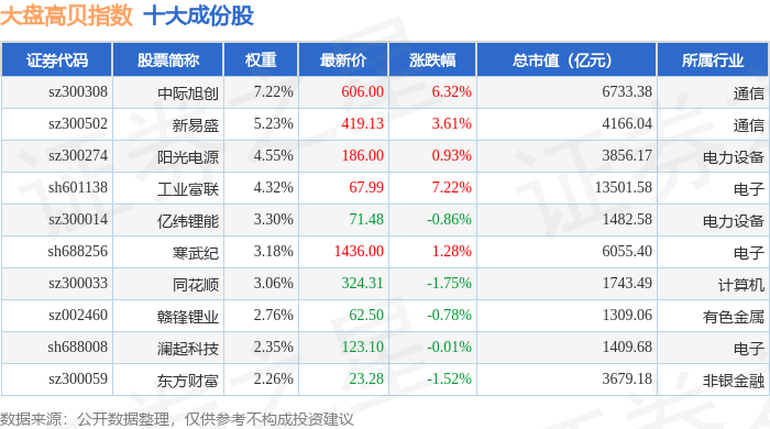 大盘高贝(399405)指数十大成份股详情如下: