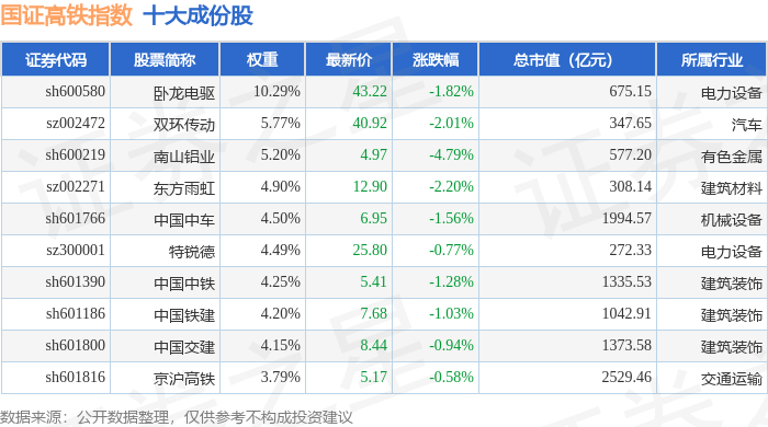国证高铁(399419)指数十大成份股详情如下: