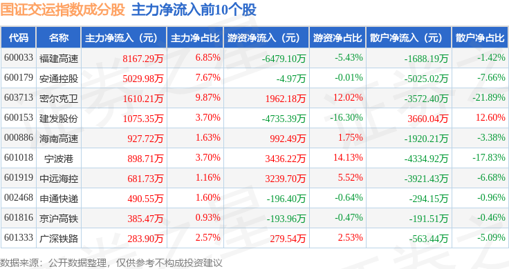 资金流向方面,国证交运(399433)指数成份股当日主力资金净流出合计5.04亿元,游资资金净流入合计3.98亿元,散户资金净流入合计1.06亿元。成份股资金流向详情见下表: