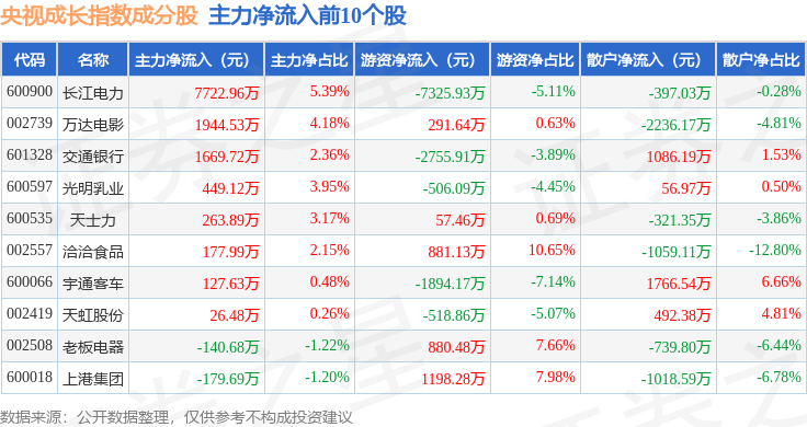 资金流向方面,央视成长(399552)指数成份股当日主力资金净流出合计47.97亿元,游资资金净流入合计21.75亿元,散户资金净流入合计26.22亿元。成份股资金流向详情见下表: