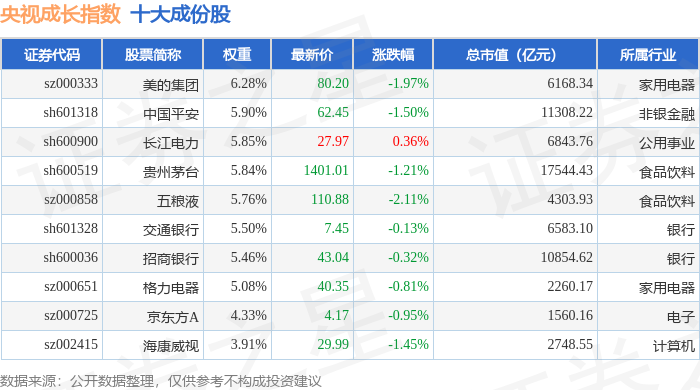 央视成长(399552)指数十大成份股详情如下: