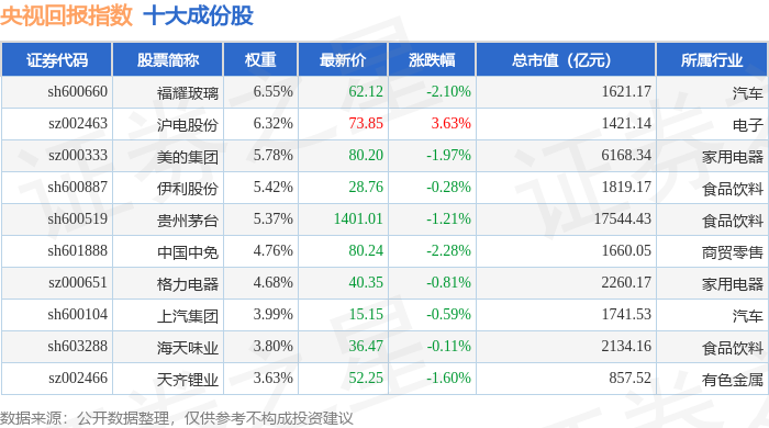央视回报(399553)指数十大成份股详情如下: