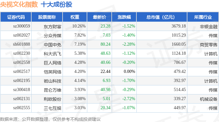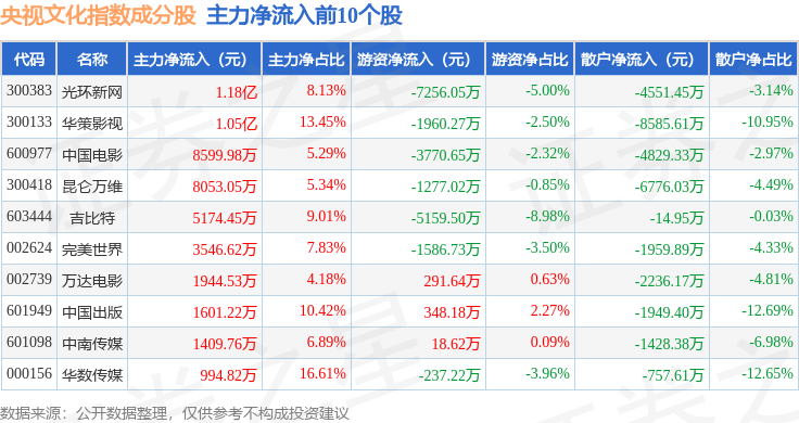 资金流向方面,央视文化(399557)指数成份股当日主力资金净流出合计19.95亿元,游资资金净流入合计2.03亿元,散户资金净流入合计17.92亿元。成份股资金流向详情见下表: