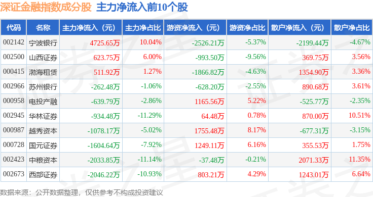资金流向方面,深证金融(399619)指数成份股当日主力资金净流出合计11.29亿元,游资资金净流入合计3.21亿元,散户资金净流入合计8.08亿元。成份股资金流向详情见下表: