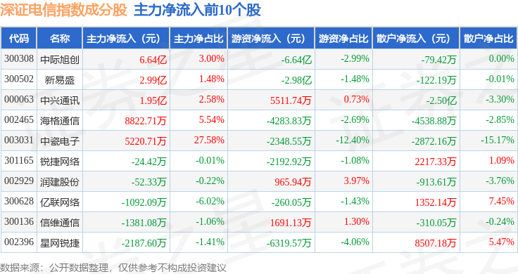 资金流向方面,深证电信(399621)指数成份股当日主力资金净流出合计10.13亿元,游资资金净流出合计9.1亿元,散户资金净流入合计19.23亿元。成份股资金流向详情见下表: