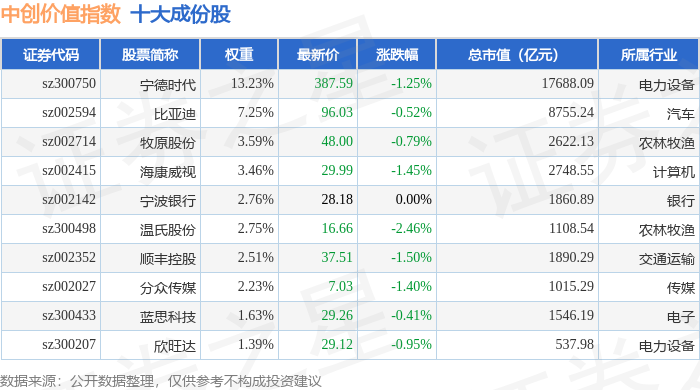 证券之星消息,12月9日,中创价值(399627)指数报收于2447.89点,跌1.09%,成交717.86亿元,换手率1.11%。当日该指数成份股中,上涨的有33家,广电计量以6.2%的涨幅领涨,下跌的有131家,科达利以7.09%的跌幅领跌。