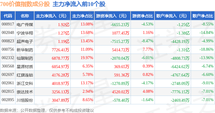 资金流向方面,700价值(399629)指数成份股当日主力资金净流出合计14.6亿元,游资资金净流入合计5.27亿元,散户资金净流入合计9.33亿元。成份股资金流向详情见下表: