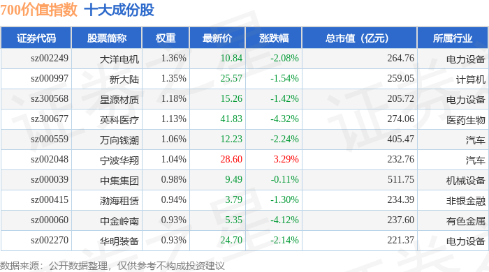 证券之星消息,12月9日,700价值(399629)指数报收于2834.74点,跌0.91%,成交497.25亿元,换手率1.72%。当日该指数成份股中,上涨的有44家,超声电子以9.99%的涨幅领涨,下跌的有183家,中国天楹以7.75%的跌幅领跌。