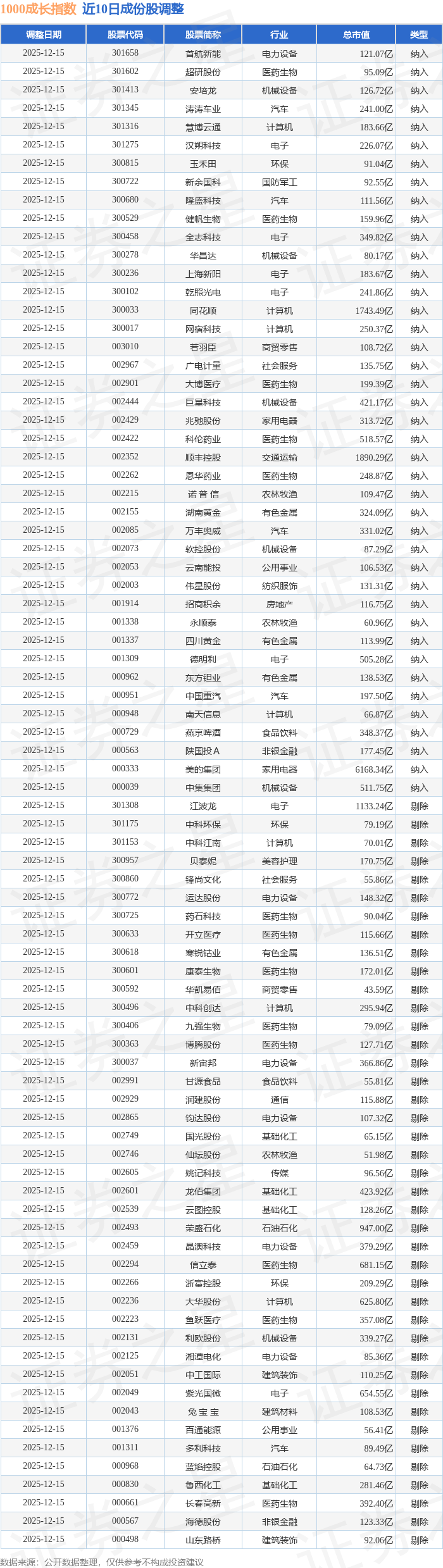 1000成长(399630)指数十大成份股详情如下: