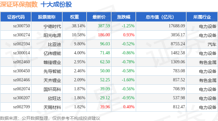 证券之星消息,12月9日,深证环保(399638)指数报收于7519.09点,跌0.88%,成交543.76亿元,换手率1.07%。当日该指数成份股中,上涨的有6家,迈为股份以1.51%的涨幅领涨,下跌的有33家,科达利以7.09%的跌幅领跌。