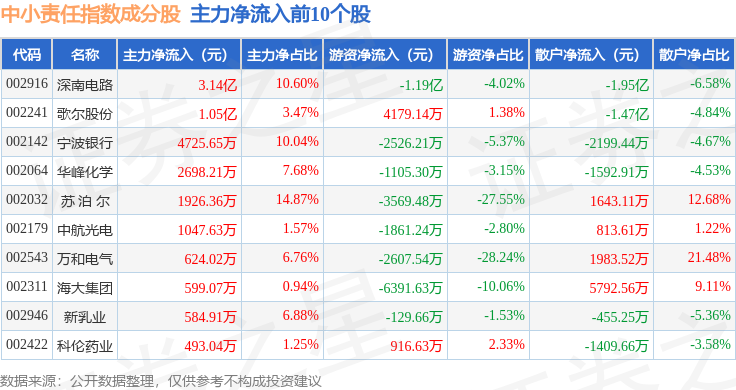 资金流向方面,中小责任(399651)指数成份股当日主力资金净流出合计7.77亿元,游资资金净流出合计1.41亿元,散户资金净流入合计9.19亿元。成份股资金流向详情见下表: