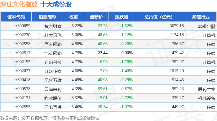 深证文化(399654)指数十大成份股详情如下: