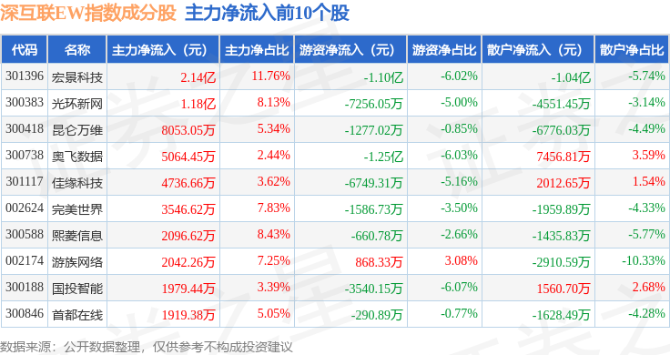资金流向方面,深互联EW(399677)指数成份股当日主力资金净流出合计38.11亿元,游资资金净流入合计8719.13万元,散户资金净流入合计37.24亿元。成份股资金流向详情见下表: