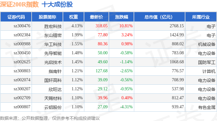 证券之星消息,12月9日,深证200R(399679)指数报收于6100.88点,跌0.5%,成交1666.87亿元,换手率1.53%。当日该指数成份股中,上涨的有41家,胜宏科技以10.81%的涨幅领涨,下跌的有154家,科达利以7.09%的跌幅领跌。