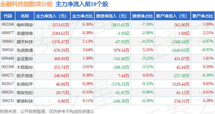 资金流向方面,金融科技(399699)指数成份股当日主力资金净流出合计38.56亿元,游资资金净流入合计1.16亿元,散户资金净流入合计37.02亿元。成份股资金流向详情见下表: