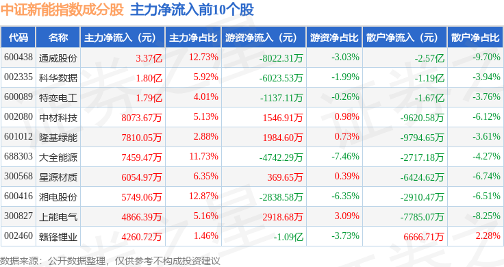 资金流向方面,中证新能(399808)指数成份股当日主力资金净流出合计26.33亿元,游资资金净流入合计6.5亿元,散户资金净流入合计19.25亿元。成份股资金流向详情见下表: