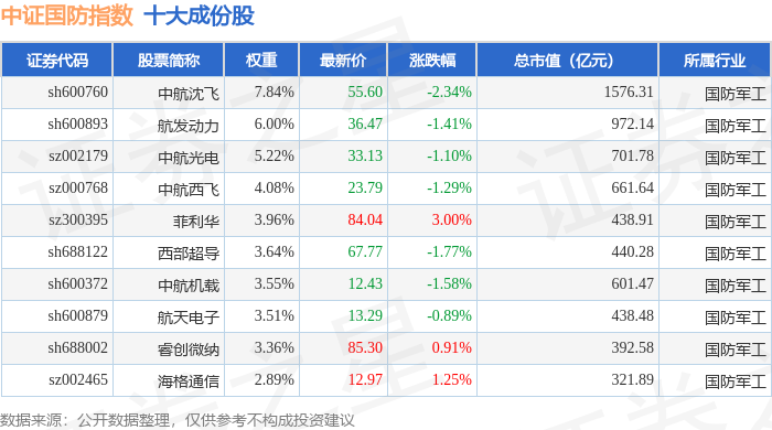 资金流向方面,中证国防(399973)指数成份股当日主力资金净流出合计12.96亿元,游资资金净流入合计1.11亿元,散户资金净流入合计11.86亿元。成份股资金流向详情见下表: