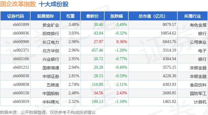 国企改革(399974)指数十大成份股详情如下: