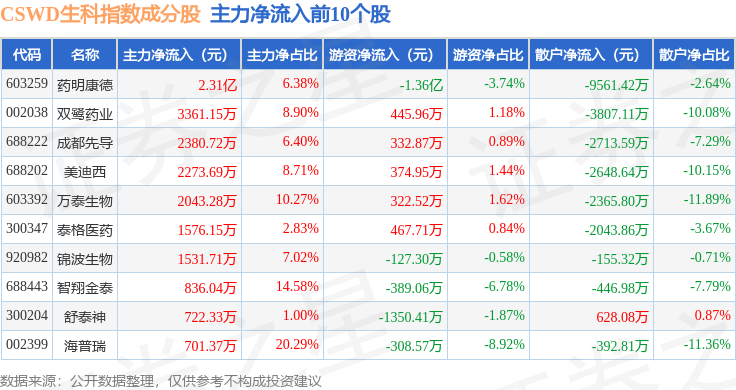 资金流向方面,CSWD生科(399993)指数成份股当日主力资金净流出合计2.08亿元,游资资金净流入合计1.75亿元,散户资金净流入合计2796.08万元。成份股资金流向详情见下表: