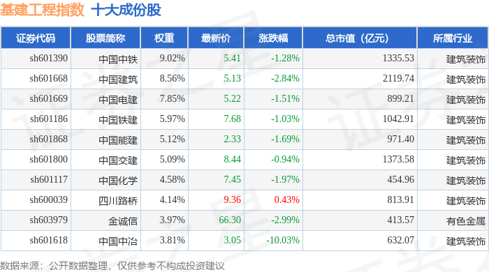 证券之星消息,12月9日,基建工程(399995)指数报收于3814.57点,跌1.69%,成交170.4亿元,换手率1.15%。当日该指数成份股中,上涨的有8家,汇绿生态以2.46%的涨幅领涨,下跌的有41家,中国中冶以10.03%的跌幅领跌。