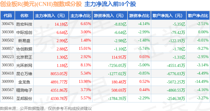 创业板R(美元)(CNH)(470007)指数十大成份股详情如下: