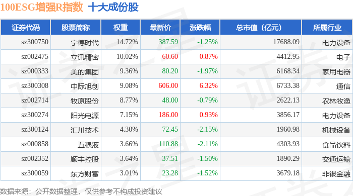 证券之星消息,12月9日,100ESG增强R(470033)指数报收于1782.56点,涨0.08%,成交1122.86亿元,换手率1.23%。当日该指数成份股中,上涨的有9家,中际旭创以6.32%的涨幅领涨,下跌的有31家,北新建材以2.87%的跌幅领跌。