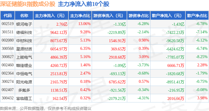 资金流向方面,深证储能R(470036)指数成份股当日主力资金净流出合计26.54亿元,游资资金净流入合计3.99亿元,散户资金净流入合计22.54亿元。成份股资金流向详情见下表: