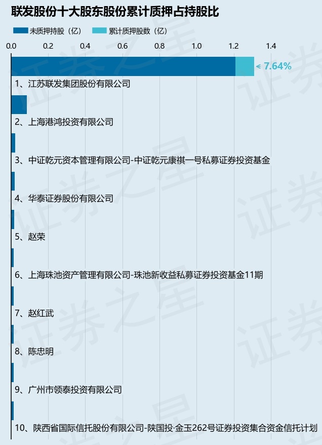截止本公告日,股东江苏联发集团股份有限公司已累计质押股份1000.0万股,占其持股总数的7.64%。本次质押后联发股份十大股东的累计质押股份占持股比例(占持股比例的计算以公司最新一期财务报表公布的十大股东的持股总数为基准)见下图: