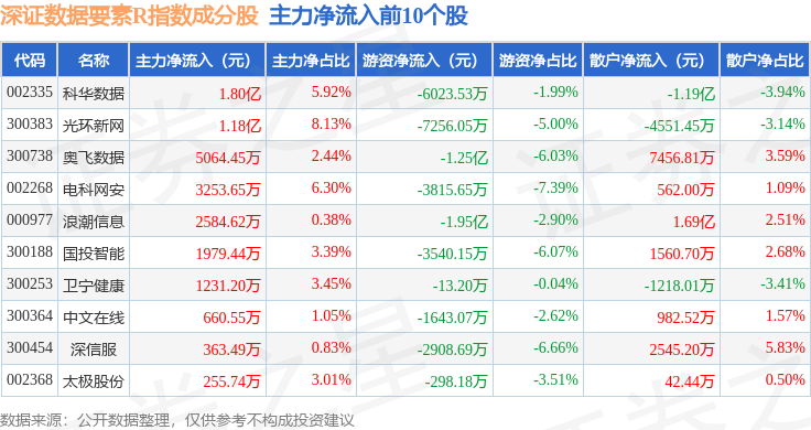 资金流向方面,深证数据要素R(470053)指数成份股当日主力资金净流出合计36.8亿元,游资资金净流入合计1.49亿元,散户资金净流入合计35.31亿元。成份股资金流向详情见下表: