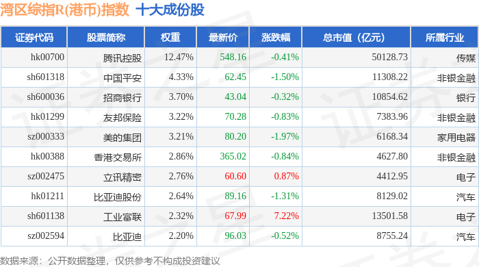 湾区综指R(港币)(480004)指数十大成份股详情如下:
