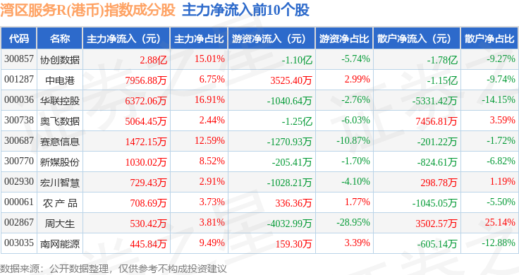 资金流向方面,湾区服务R(港币)(480012)指数成份股当日主力资金净流出合计12.23亿元,游资资金净流出合计3712.36万元,散户资金净流入合计12.6亿元。成份股资金流向详情见下表: