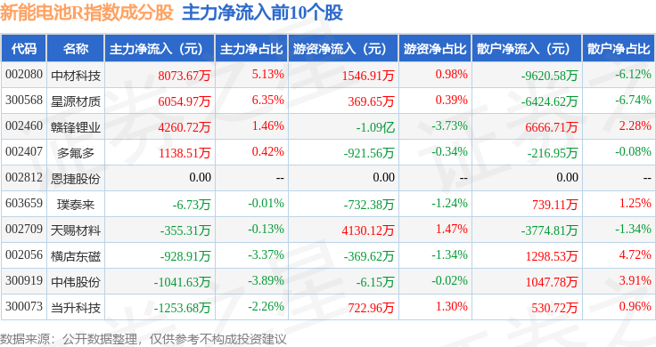 资金流向方面,新能电池R(480032)指数成份股当日主力资金净流出合计29.92亿元,游资资金净流入合计5.73亿元,散户资金净流入合计23.61亿元。成份股资金流向详情见下表:
