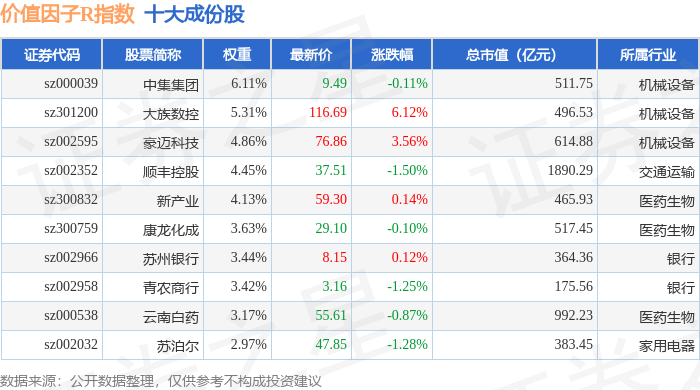 证券之星消息,12月9日,价值因子R(480056)指数报收于3176.37点,跌0.19%,成交322.1亿元,换手率0.94%。当日该指数成份股中,上涨的有12家,大族数控以6.12%的涨幅领涨,下跌的有38家,盐湖股份以3.72%的跌幅领跌。