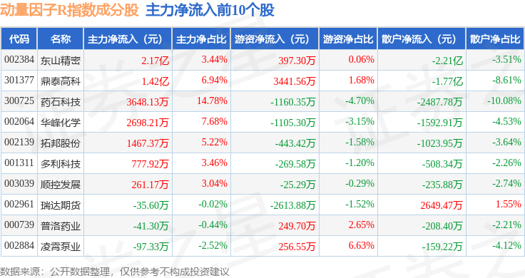 资金流向方面,动量因子R(480057)指数成份股当日主力资金净流出合计26.82亿元,游资资金净流入合计5.94亿元,散户资金净流入合计20.88亿元。成份股资金流向详情见下表: