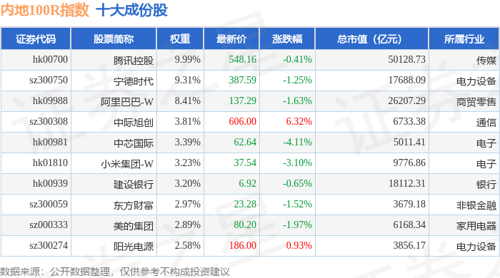 内地100R(483001)指数十大成份股详情如下: