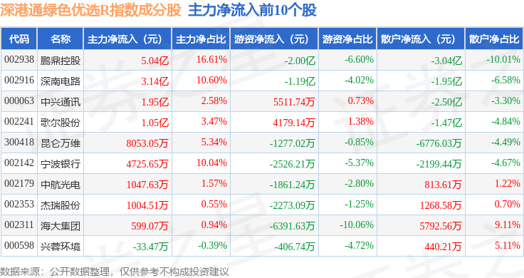 资金流向方面,深港通绿色优选R(483011)指数成份股当日主力资金净流出合计27.8亿元,游资资金净流入合计3.89亿元,散户资金净流入合计23.91亿元。成份股资金流向详情见下表: