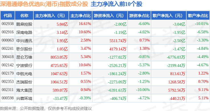 资金流向方面,深港通绿色优选R(港币)(483012)指数成份股当日主力资金净流出合计27.8亿元,游资资金净流入合计3.89亿元,散户资金净流入合计23.91亿元。成份股资金流向详情见下表:
