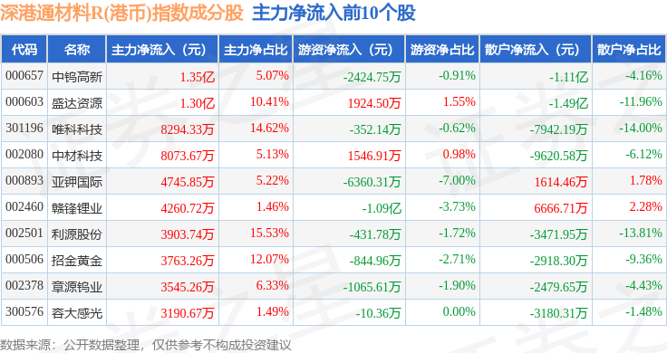 资金流向方面,深港通材料R(港币)(483016)指数成份股当日主力资金净流出合计56.95亿元,游资资金净流入合计11.85亿元,散户资金净流入合计45.09亿元。成份股资金流向详情见下表: