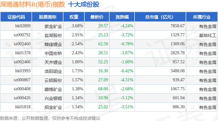 深港通材料R(港币)(483016)指数十大成份股详情如下: